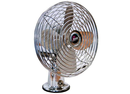 12 Volt 2 speed fan is all metal with 6 Inch fan blade. Fan switch is mounted on base and fan can be mounted on ceiling or deck. Available in chrome or black finish.